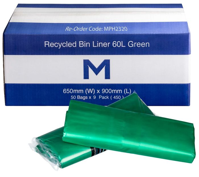 60ltr Green Recycled Rubbish Bags 650x900mm -50pk