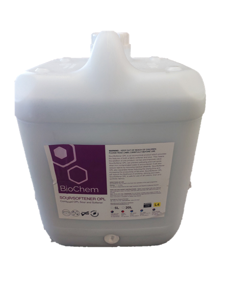 Sour/Softener OPL is an economical product which provides the features of both a fabric softener and sour. This means the addition of one product, not two and improves value. Sour/Softener OPL can prevent yellowing and rust spots when iron contaminated water is encountered. It will also reduce rejects by removing residual alkalinity. Sour/Softener OPL also separates fibres reducing the drying time and increasing the productivity of flat work. Sour/Softener OPL will reduce the likelihood of wrinkling, sticking and static. Sour/Softener OPL is safe for use on all cottons, linen and synthetic fabrics.