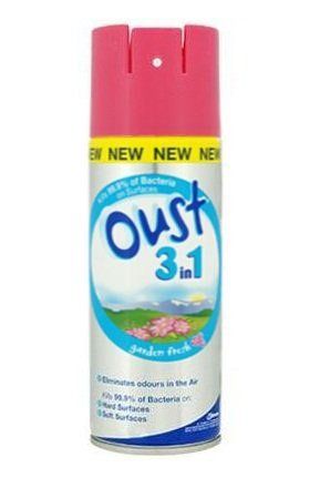 Oust® 3in1 kills 99.9% of germs, bacteria, viruses and fungi on hard, non-porous surfaces. It disinfects and deodorizes by killing common germs and controlling their odors. It works to eliminate odors in the air by killing odor-causing bacteria, and also prevents odors at their source caused by germs, bacteria and mildew. Oust ® 3in1 also deodorizes soft surfaces.