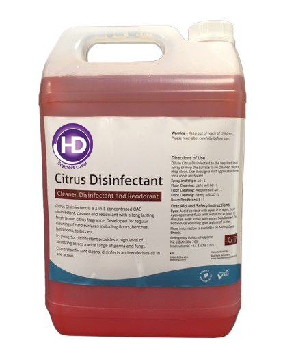 Hygiene Direct Citrus Disinfectant is a 3 in 1 concentrated QAC disinfectant, cleaner and reodorant with long lasting fresh lemon citrus fragrance. Developed for regular cleaning of hard surfaces including floors, benches, bathrooms, toilets etc.